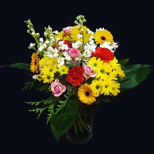 Alegría de Verano , está compuesto de un Ramo Variado con Claveles, Margaritas, Alelí, Gerberas en tonos primaverales, ideal para dar alegría, vida y optimismo.
