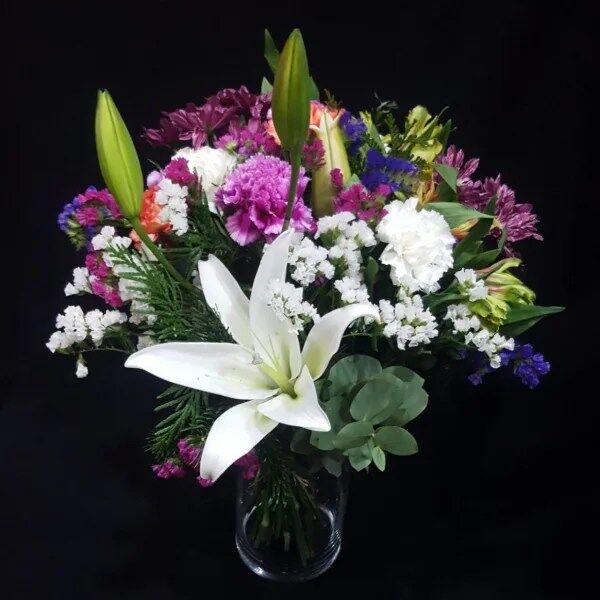 Se refiere a un Ramo de Flores Naturales con Lilium Oriental, Claveles, Margaritas, Alstroemerias y Statice (siempre viva) y Verdes.