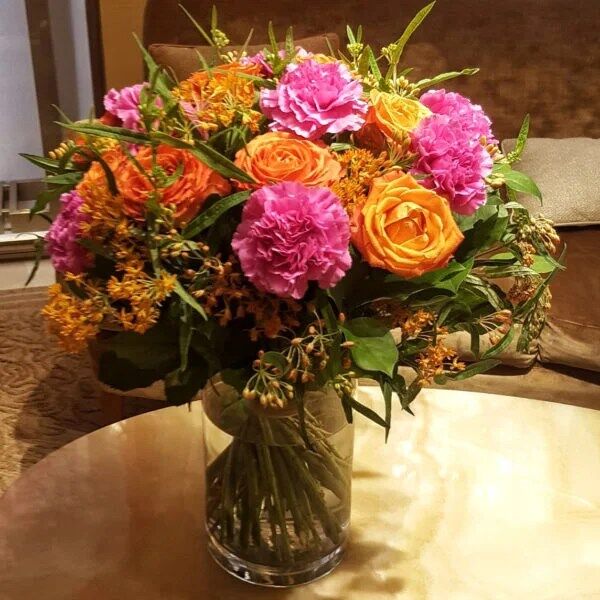 Ámsterdam en verano es un hermoso ramo de flores naturales de Rosas Naranjas con Claveles Fucsia, que además, se complementa con un hermoso follaje, brindando así, un estupendo movimiento, belleza y frescura al mismo.