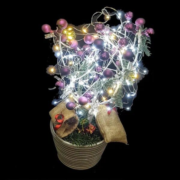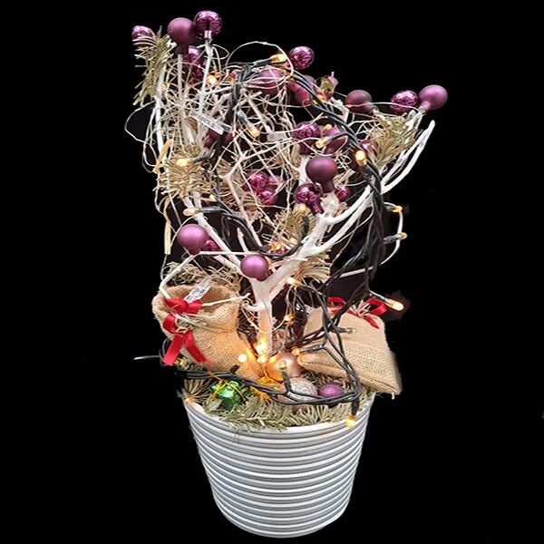 El Árbol Navideño Artesanal , está compuesto por una base de cerámica blanca; 2 juegos de luces a batería (ideal para ubicarlo en cualquier habitación, sin tener que depender de tomas o prolongaciones eléctricas); adornado su tronco central blanco con bolillas de color y regalitos. Listo para disfrutarlo en familia, amigos y compañeros de oficina en éstas Fiestas.