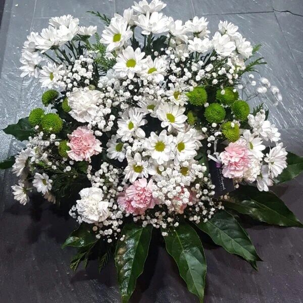 Éste Centro Funerario Rural refleja la frescura del campo y la belleza que luce cuando todo está florecido, y ello lo quiere representar en éste centro con Margaritas Blancas, Claveles, Crisantemo Verde y Paniculata.