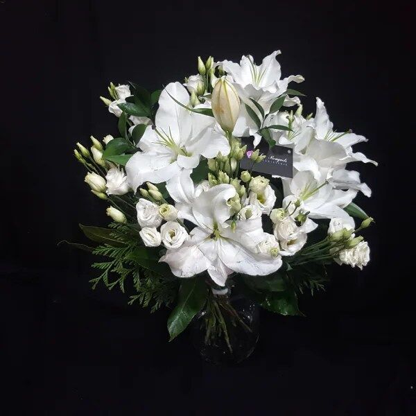 Una belleza natural de flores blancas que perfuman el ambiente en el cual se ubique. Por lo tanto, es un maravilloso Ramo de Lilium Blanco con complemento de otras flores del mismo color, donde se destaca la Pureza total y además, sus verdes elegantes hacen del ramo de una elegancia total.