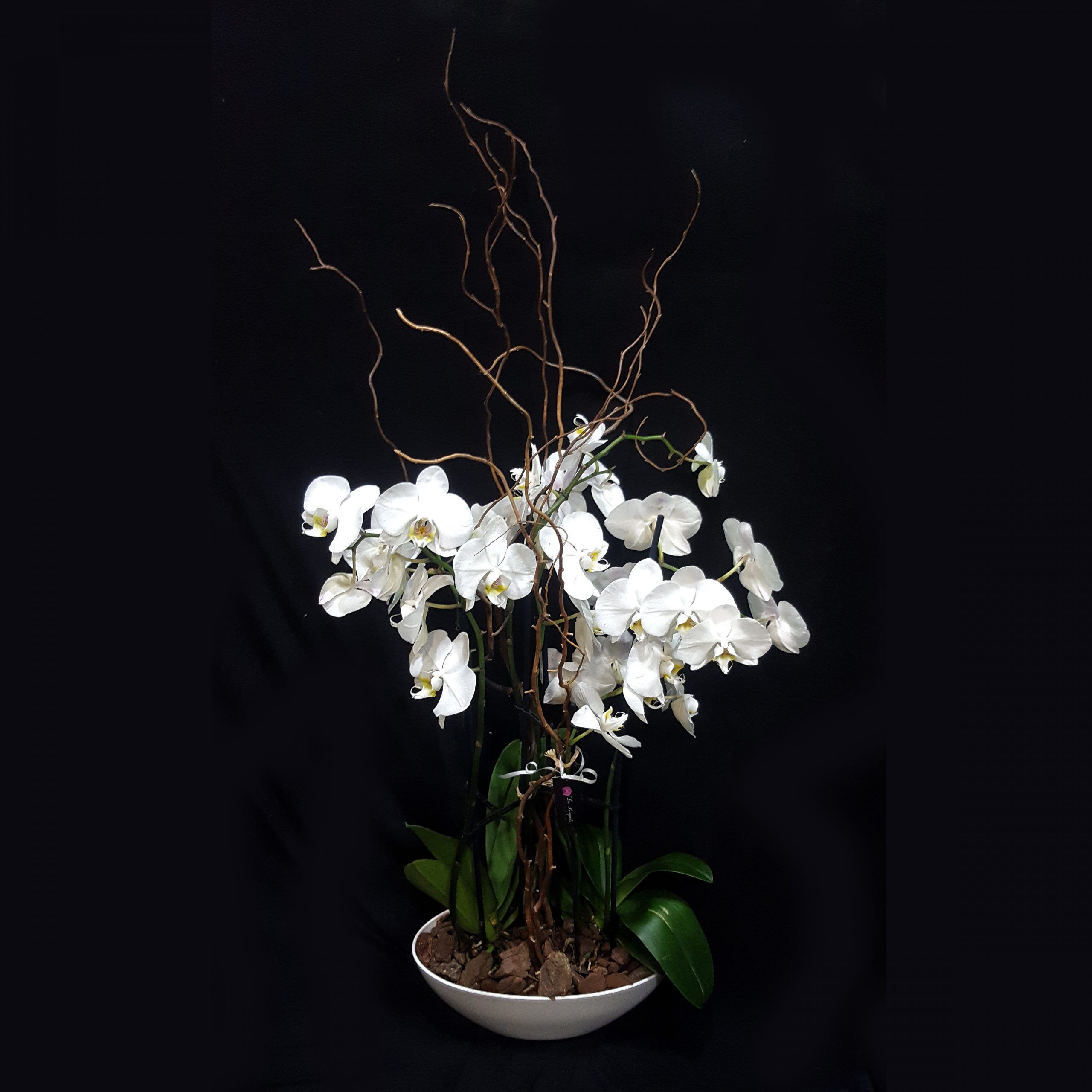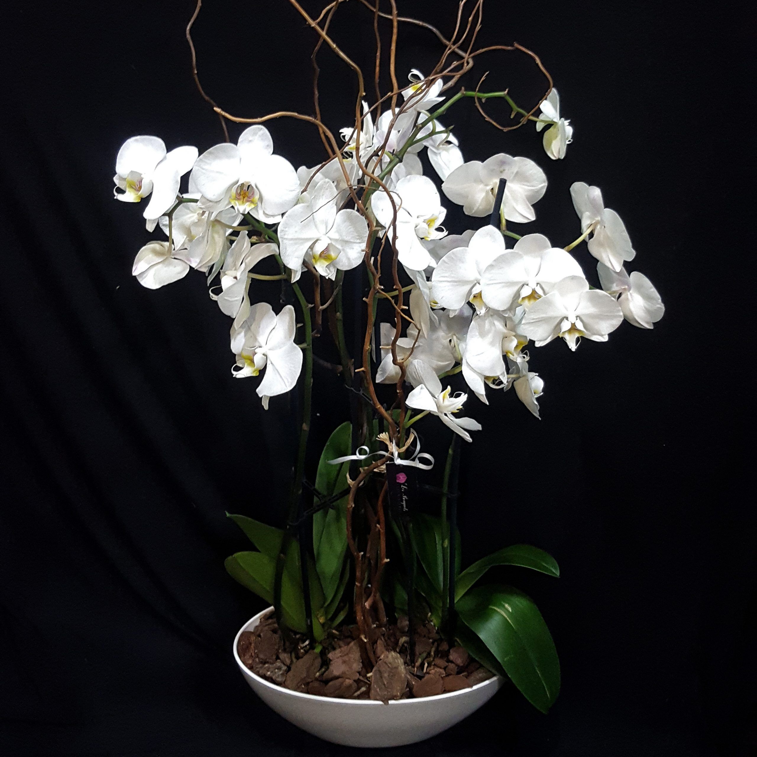 Centro de 2 plantas de Orquídeas Phaleanopsis Blancas de 2 baras, más baras de Salix brindando una cierta elegancia y armonía a todo su conjunto. La altura de las plantas son de aprox. 60cm y sus bases están cubierta con corteza. Todo este hermoso conjuntose luse sobre en una base blanca de plástico; que en caso de desearlo con otro tipo de base como de cristal o cerámica no dude en consultarnos o bien por movil o WhatsApp.