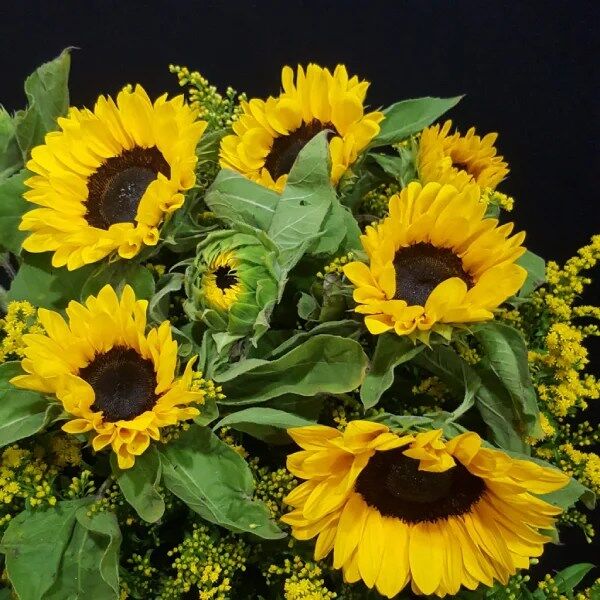 Es un ramo de flores naturales de Girasoles, con solidago y Verdes, donde representa y simboliza la luz, el Sol, el amor y la admiración hacia la persona que está a tu lado. ello depende también de las diferentes culturas.